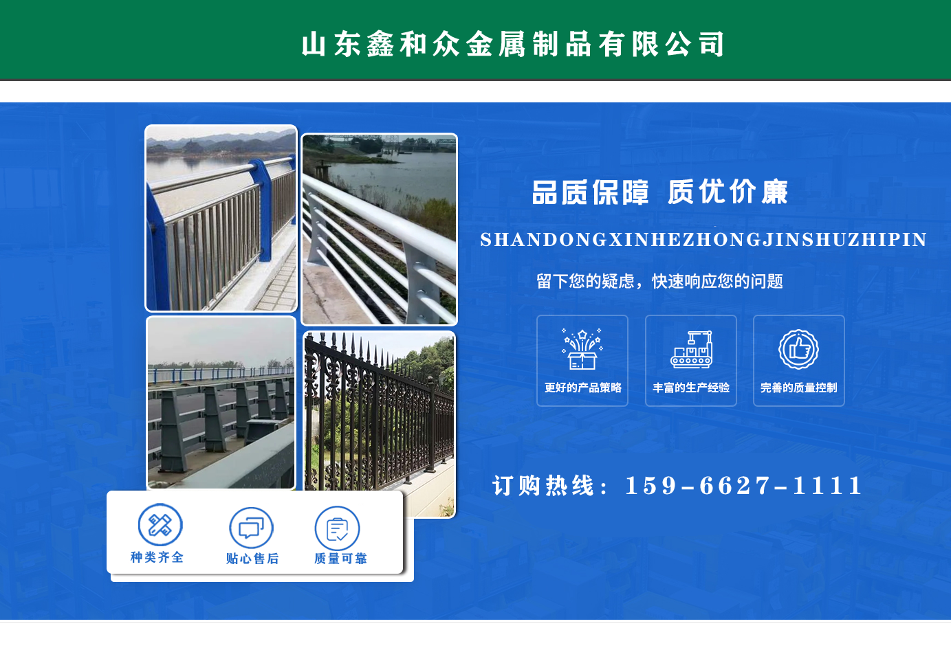 山東鑫和眾金屬制品有限公司主要產(chǎn)品有防撞護欄,橋梁護欄,道路護欄,河道護欄,不銹鋼護欄等護欄。提供設計方案,一站式定制,包您滿意價格優(yōu)惠,歡迎來電咨詢! 公司常年從事銷售護欄防撞護欄,橋梁護欄,道路護欄,河道護欄,不銹鋼護欄,橋梁鋼護欄,河道燈光護欄等。產(chǎn)品廣泛應用于橋梁、河道、旅游景區(qū)、道路、公路、公園、小區(qū)、景觀、道路防撞等領域。 公司產(chǎn)品均采用優(yōu)質(zhì)不銹鋼材料,符合相關標準。各種型號不銹鋼復合管及護欄,質(zhì)量嚴格把控。產(chǎn)品強度高、耐腐蝕、焊接牢固、抗沖擊、性能好,防撞護欄結(jié)構(gòu)簡單、美觀實用大方。 歡迎前來訂購!...